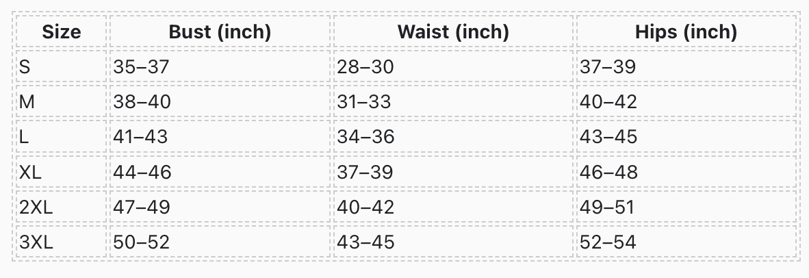 | Size | Bust (inch) | Waist (inch) | Hips (inch) |